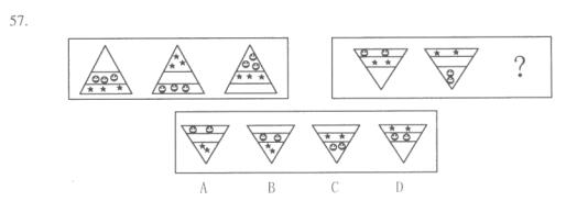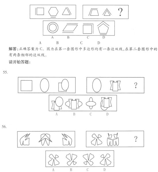 2.每道题包含两套图形和可供选择的4个图形。这两套图形具有某种相似性,也存在某种差异。要求你从四个选项中选择你认为最适合取代问号的一个。正确的答案应不仅使两套图形表现出最大的相似性,而且使第二套图形也表现出自己的特征。