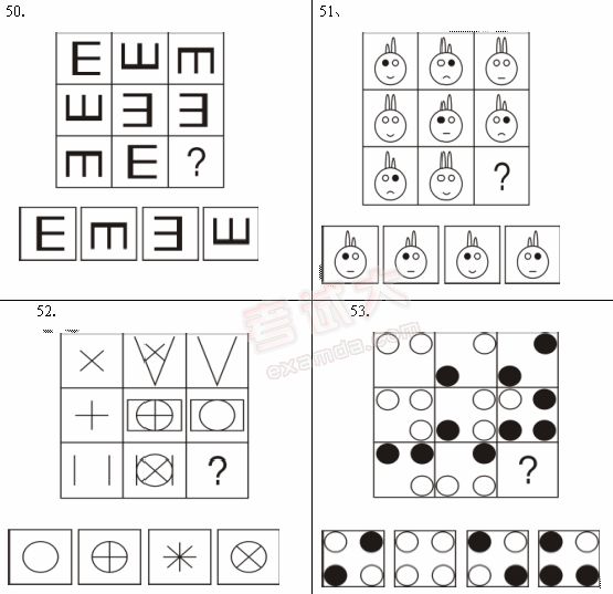 图形推理:共8 8题。包括两种类型的题目:每道题目的左右4 4个图形呈现一定的规律性,你需要在右边所给出的备选答案中选出一个最合合理的答案使之符合左边的规律性。每道题只有一个正确答案。