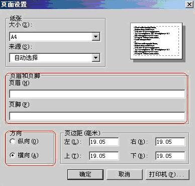 将页面设置窗口中‘方向’内容选择为‘横向’,页眉和页脚下输入框内容删除