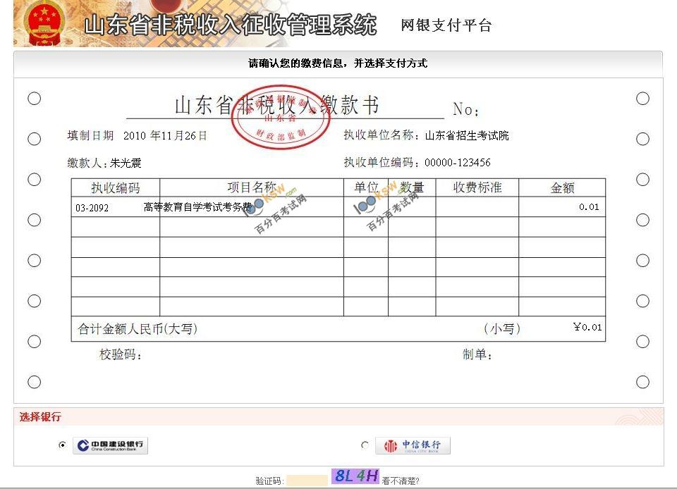 第三步:确认缴费信息,选择支付银行“中国建设银行”。